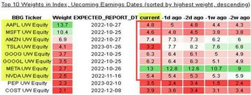 But back to the equity market, this week’s huge wall of US corporate earnings (46% of S&P members reporting) should be top of mind for most as McElligott reminders traders that inflation is still acting as a “tailwind” for EPS via “pricing power” into a “still too strong” consumer, but this ‘potential good news’ is juxtaposed against a market positioned for “top-down” macro bearish outcomes, expecting lower volumes / sales to begin bleeding into weaker guides…