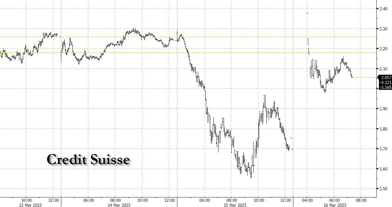 Credit Suisse shares jumped 40%, most on record, at the European open after the lender tapped the Swiss National Bank for as much as 50 billion francs and offered to repurchase debt, but have since trimmed gains in half amid speculation confirming our skeptical view voiced last night that the bailout would be insufficient. The shares fell 24% on Wednesday after its top shareholder ruled out a bigger investment.