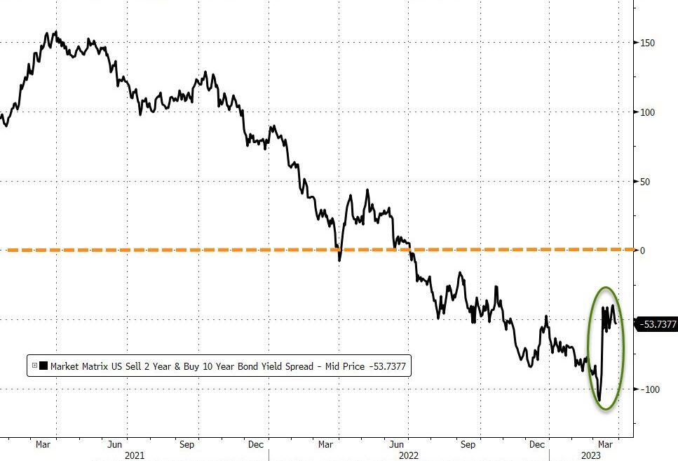 US index futures extended their gains for a third day, approaching 4,100 – the highest level in over a month – amid easing concerns around the banking crisis and as investors weighed the likelihood that a peak in interest rates is nearing. As of 730am ET, S&P 500 futures were up 0.5% near session highs of 4,080 while the Nasdaq rose 0.6%. The tech-heavy index is set for its best quarter since 2020, pushing into a bull market Wednesday and closing at the highest level since August in a sign investors are preparing for the Fed to end its interest rate hiking cycle and potentially pivot to looser policy later this year. On Wednesday, the gauge entered a new bull market, rising more than 20% from December lows. The yield curve steepened as the 10Y yield dipped 2bps to 3.54%, while the DXY has resumed its selloff and remains below its 50, 100, and 200dma. Commodities are stronger with all 3 complexes stronger.