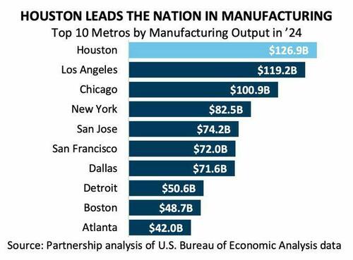 Manufacturing tells that story best. Houston produced $126.9 billion in manufactured goods in 2024, leading every metro in the country for the third straight year. More than Los Angeles. More than Chicago. More than double Detroit. Recent project announcements from Foxconn, Eli Lilly, and Tesla signal that this base is expanding well beyond its petrochemical roots.