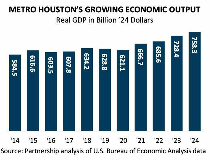 Metro Houston’s GDP hit $758.3 billion in 2024, crossing three-quarters of a trillion dollars in real, inflation-adjusted terms for the first time on record. That makes Houston the 6th largest metro economy in the United States, ahead of Washington D.C. and closing in fast on the cities above it.