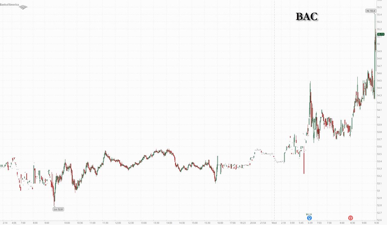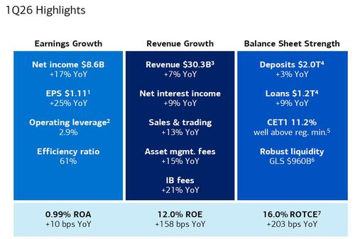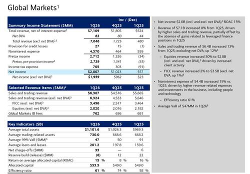Revenue from equity trading climbed 30% to $2.8 billion in the first quarter, beating expectations, while fixed-income trading, which fell short of a consensus of analyst estimates, rose less than 1% to $3.5 billion, similar to Goldman’s FICC miss. Bank have benetted from a volatile quarter, when the Iran war sent oil prices surging and concerns about artificial intelligence and private credit whipsawed stocks. Trading desks were already on a roll since President Donald Trump won the 2024 election, as his policy moves often spurred reactions across stocks, commodities and rates. The total trading haul helped push revenue to $30.3BN, above the $29.92BN consensus estimate, while adjusted EPS rose 25% to $1.11 a share, also beating the $1.01 analyst estimate. Overall, Bank of America’s net income was up 17.3% to $8.16 billion.