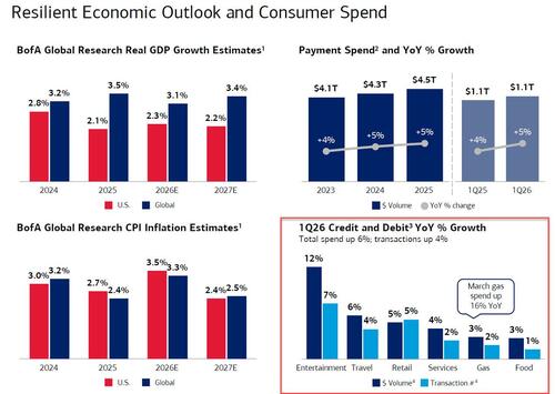 Commenting on the state of the US consumer, CEO Brian Moynihan said consumer spending points to a “resilient American economy”, while also warning of risks. Earlier, JPMorgan CEO Jamie Dimon said “the U.S. economy remained resilient in the quarter, with consumers still earning and spending and businesses still healthy.” Wells Fargo CEO Charlie Scharf: “While markets have been volatile, we still see continued resiliency in the underlying economy and the financial health of the consumers and businesses we serve remains strong, though the impact of higher oil prices will likely take some time to materialize.”