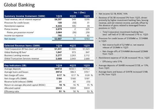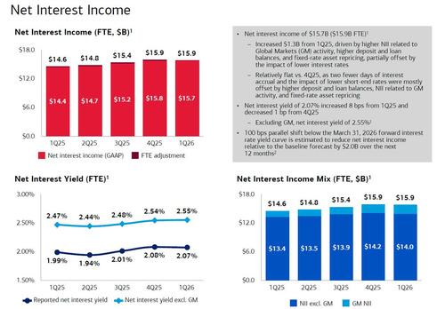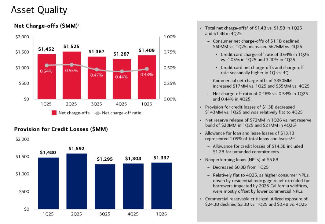 Turning to asset quality, aside from some concerns about Private Credit (see below), the results were solid with BofA’s net charge-offs down 3% to $1.41 billion, below the estimate of $1.42 billion while the provision for credit losses also dropped to $1.34 billion, and also below estimates of $1.5 billion, and down $143MM YoY. As BBG notes, the number “came in way below estimates, offsetting larger-than-expected numbers for some of its peers. Overall, the combined tally is tracking lower than feared, helping soothe concerns about private-credit contagion into financials.” BofA also announced a net reserve release of $72MM in 1Q26 vs. net reserve build of $28MM in 1Q25 and $21MM in 4Q25. Meanwhile, the allowance for loan and lease losses of $13.1B represented 1.09% of total loans and leases. Nonperforming loans (NPLs) of $5.8B decreased $0.3B from 1Q25, and were flat to 4Q25, as higher consumer NPLs, driven by residential mortgage relief extended for borrowers impacted by 2025 California wildfires, were mostly offset by lower commercial NPLs.