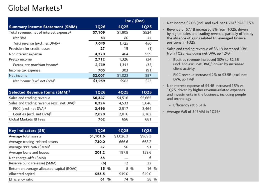 As an aside, noninterest expense of $4.4B increased 15% vs. 1Q25, driven by higher revenue-related expenses and investments in the business, including people and technology. Lastly, average Q1 VaR tumbled to just $47MM in 1Q26 as even trading desks retrenched.