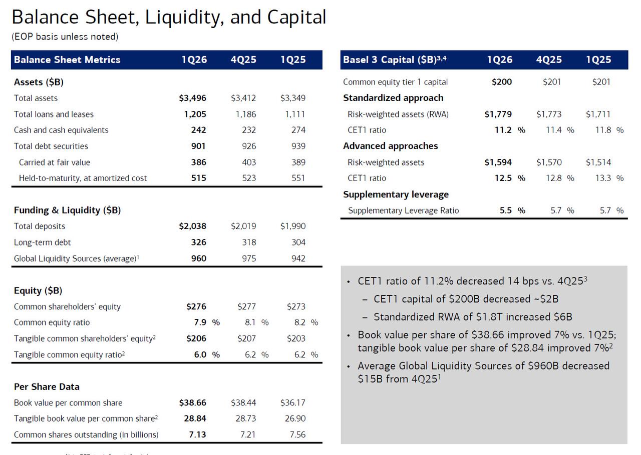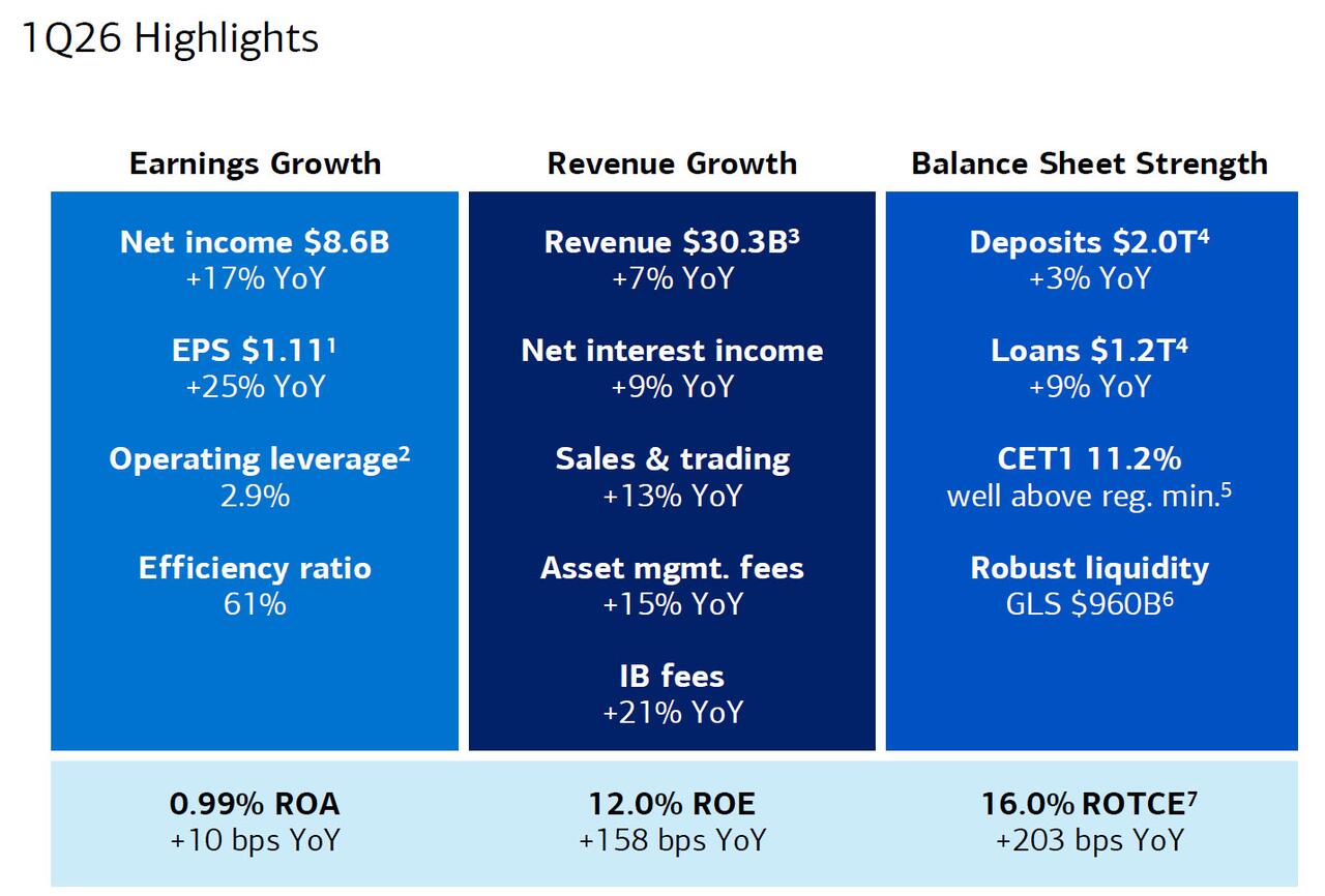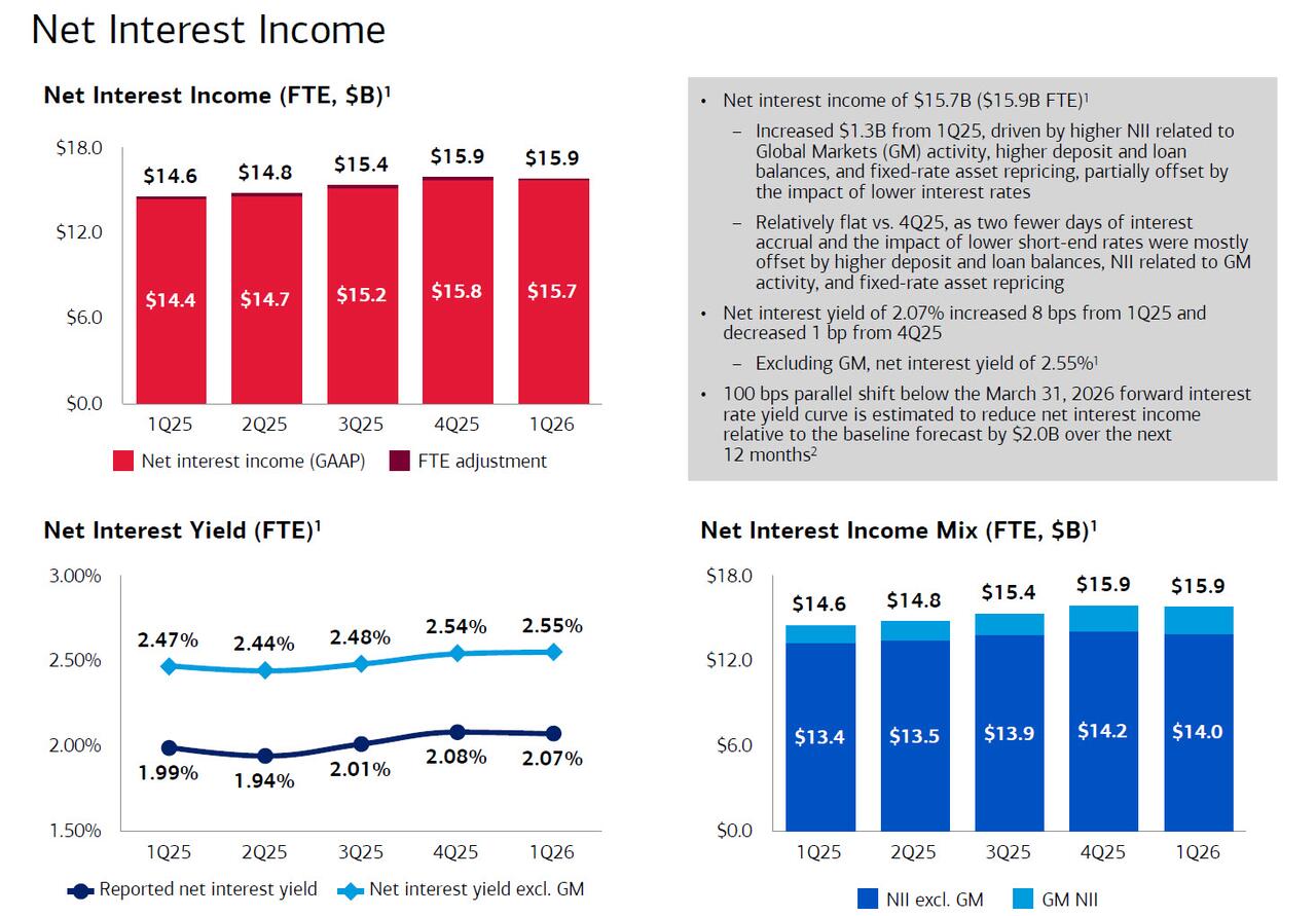 Last month, BofA Co-President Dean Athanasia said that he was feeling good about net interest income, expecting growth of at least 7%. Well, the final number was even stronger, and the bank reported NII of $15.7 billion, up 9% from the first quarter of 2025 (more below). Just as importantly, BofA raised its full-year NII forecast, now expecting it to grow 6%–8%, up from previous estimates of 5%–7%, driven by strong first-quarter performance, and suggesting the Fed’s rate cuts won’t negatively impact the bank.