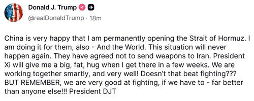 With oil prices remaining elevated, with Brent crude trading about 33% higher than before the start of the war, Trump has issued a new Truth Social claiming China is “very happy that I am permanently opening the Strait of Hormuz.” This even though in many cases it is China bound tankers being blocked and turned back by the US naval armada. “This situation will never happen again,” Trump added. He is set to meet with Xi in Beijing on May 14-15. On this he wrote that “President Xi will give me a big, fat, hug when I get there in a few weeks. We are going working together smartly, and very well!” But then Trump says “But remember, we are very good at fighting, if we have to…”