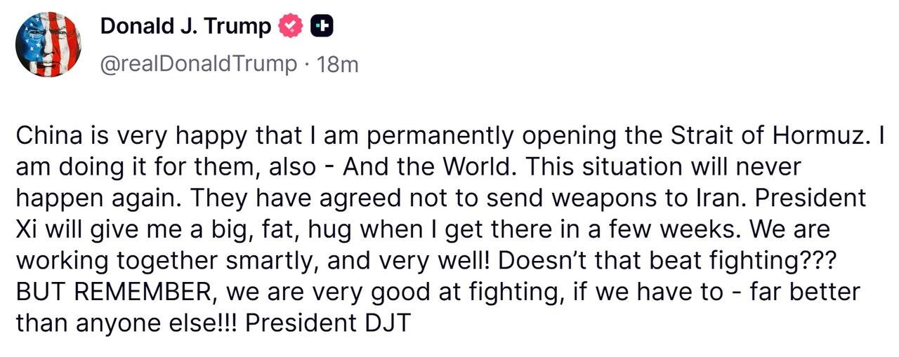 Trump claims China “very happy” the US is permanently opening the Strait of Hormuz, also Xi told him Beijing was not sending weapons/defense items to Tehran.