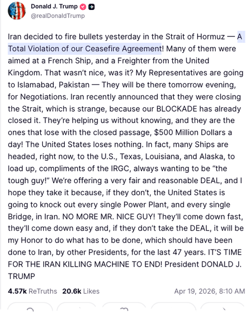 Iran decided to fire bullets yesterday in the Strait of Hormuz — A Total Violation of our Ceasefire Agreement! Many of them were aimed at a French Ship, and a Freighter from the United Kingdom. That wasn’t nice, was it?