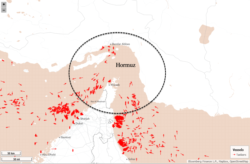 By Sunday morning, the latest Bloomberg ship tracking data showed that tanker traffic through the Strait of Hormuz had largely ground to a halt. There were multiple incidents of tankers U-turning over the last 24 hours. At the same time, a senior Iranian official renewed threats to close the Bab al-Mandeb Strait.