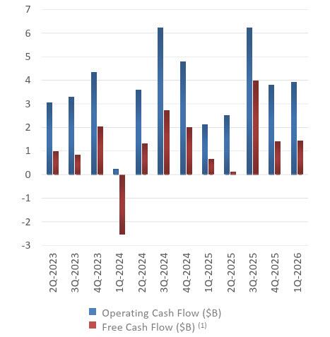 - Free Cash Flow positive $1.44B, beating est. Negative $1.86B