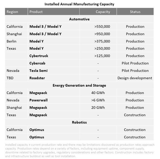- Volume: “We are focused on maximum capacity utilization at our factories. Deliveries and deployments will be impacted by aggregate demand for our products, supply chain readiness and allocation decisions between sale to customers or use for our owned and operated fleet.”