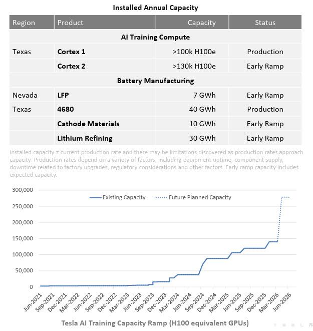 - Product: “We continue to evolve and augment our product lineup with a focus on cost, scale and future monetization opportunities via services powered by our AI software. We remain focused on growing our sales volumes through a differentiated and efficiently managed product portfolio, which includes leveraging and optimizing our existing production capacity before building new factories and production lines. Cybercab, Tesla Semi and Megapack 3 are on schedule for volume production starting in 2026. First-generation production lines for Optimus are being installed in anticipation of volume production. Capacity build out and ramp related to our multi-year infrastructure initiatives, including AI compute, solar, battery material and semiconductor manufacturing are underway.”