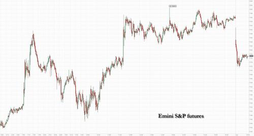 Stocks futures fell and oil and the dollar jumped in early trading, as risk sentiment was dented after Trump scrapped his envoys’ trip to Pakistan for Iran talks, breaking down momentum toward a second round of peace talks between the US and Iran, even as the Strait of Hormuz remains indefinitely blocked.