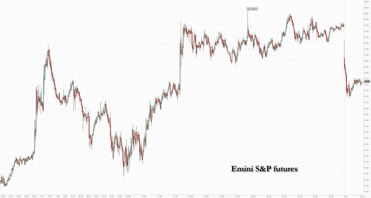 Futures contracts for the S&P 500 Index dropped 0.3% after the underlying index closed at a record on Friday, although with two-thirds of S&P constituents closing red: this was the second worst negative breadth all-time high for the S&P following the bizarre October record high when the S&P printed an ATH with 80% of stocks lower.