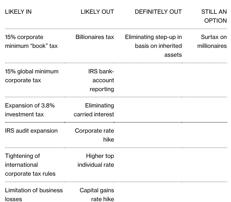 After weeks of secretive discussions, Sen. Sinema has given the Biden admin a list of specific tax policies she will support in order to raise revenue for the social spending plan, per BBG’s sources on the Hill.