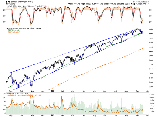 While all that sounds terrible, the total decline for the last two weeks is just -2.4%. Yes, that’s it, just 2.4%. As noted, it looks much worse on a short-term chart due to the low volatility advance this year.