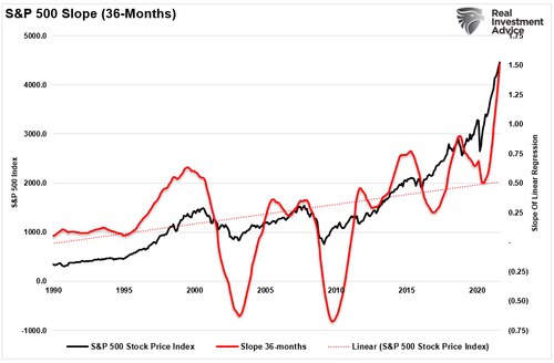 Even on a short-term basis, 1990-present, the current advance also stands out. The chart below shows the slope of the linear regression of the market. Historically, markets trade above and below that linear trend. However, currently, the slope is surging higher.
