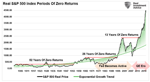 What you should take away from the chart above is apparent. Investing capital when prices are exceedingly above the underlying growth trend repeatedly had poor outcomes. Investing capital at peak deviations led to very long periods of ZERO returns on capital. (Interestingly, as the Fed became active in the markets, the periods of zero returns got cut in half.)