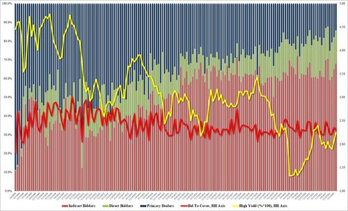 The bid to cover of 2.302 was actually not that bad, and came right on top of the six-auction average of 2.305 (and below last month’s 2.354).