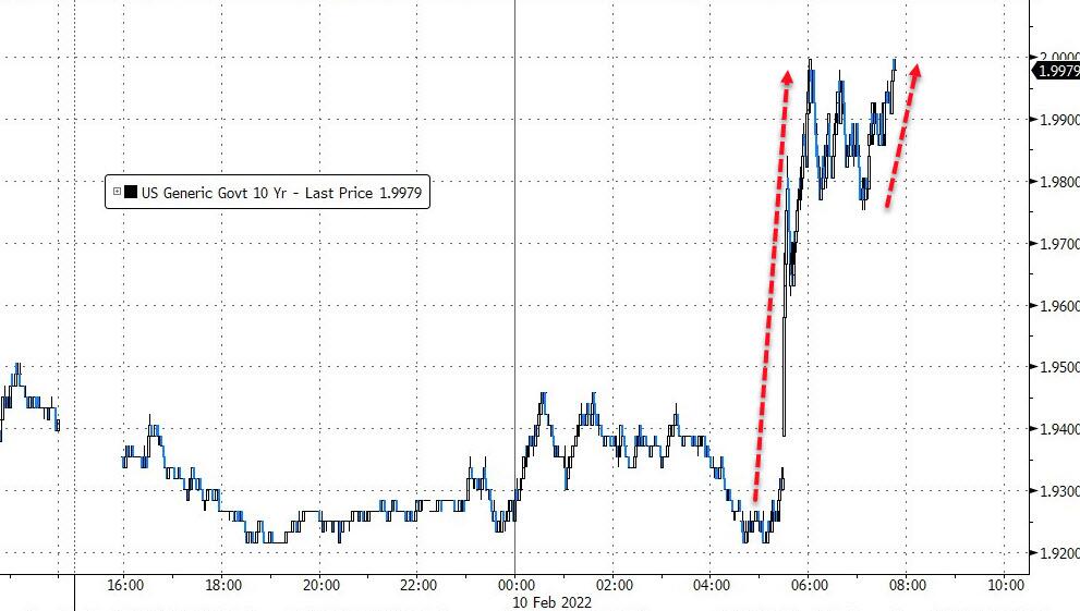 In response, yields initially spiked higher, although on a day like today when everything has exploded, it didn’t really make much of a dent since the 10Y was already trading well north of 2.00% and the 30Y above 2.30%. In fact, despite the ugly auction, yields eventually dipped after pushing to session wides, as the market scrambles to triangulate what is the correct price now that everything is in flux, the economy is overheating and a recession appears inevitable, the only question is when.