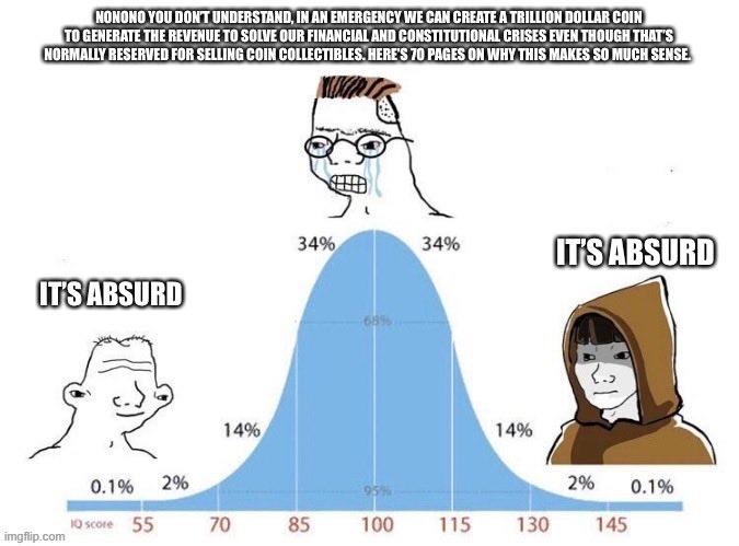 In order for a trillion dollar coin to be lawfully struck under the power granted in 5112(k), it must either be bullion (i.e., contain $1 trillion of platinum) or it must be a proof coin. MMT shitcoiners’ proposal requires a “proof coin” in order to work (and if they had $1 trillion in platinum to spare they would have long since sold it to pay for state expenditures).