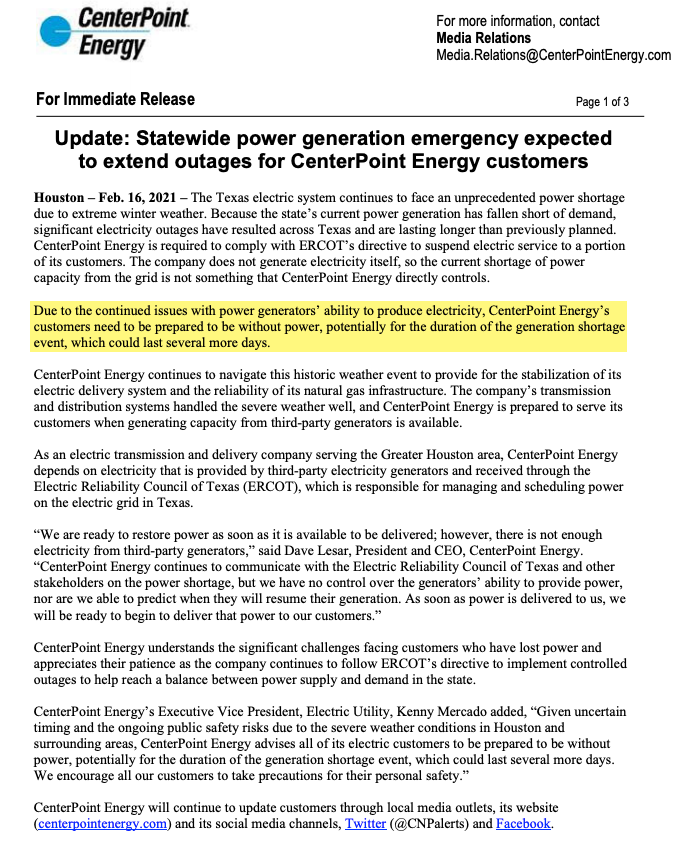 “At this time, @ERCOT_ISO is unable to predict when grid conditions will stabilize. All customers are urged to be prepared for cont’ extended outages. Please also prioritize safety. Warming stations are available in many areas- check online or call 211 for more.”
