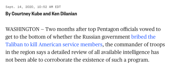 According to “officials briefed on the matter,” New York Times reported, and the Washington Post “confirmed,” that “a Russian military spy unit offered bounties to Taliban-linked militants to attack coalition forces in Afghanistan.” Two months later, an on-the-record military official was less certain:
