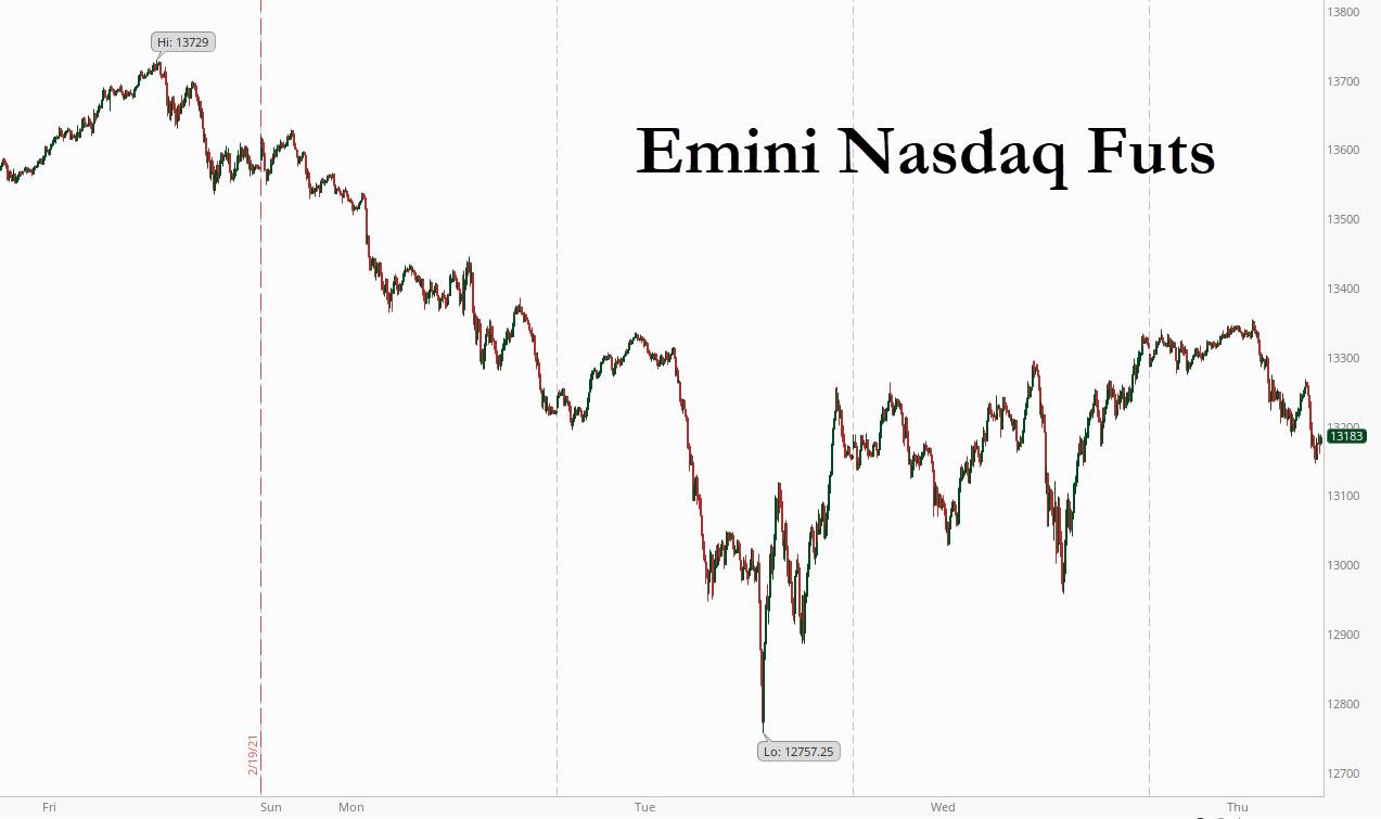 … and into small cap and reflationary shares that will benefit from an economic rebound later in the year. The Russell 2000 index rallied and S&P500 eminis were modestly in the red. At 715 am ET, Dow e-minis were up 5 points, or 0.01%, S&P 500 e-minis were down 12.35 points, or 0.3%, and Nasdaq 100 e-minis were down 123.5 points, or 1%.