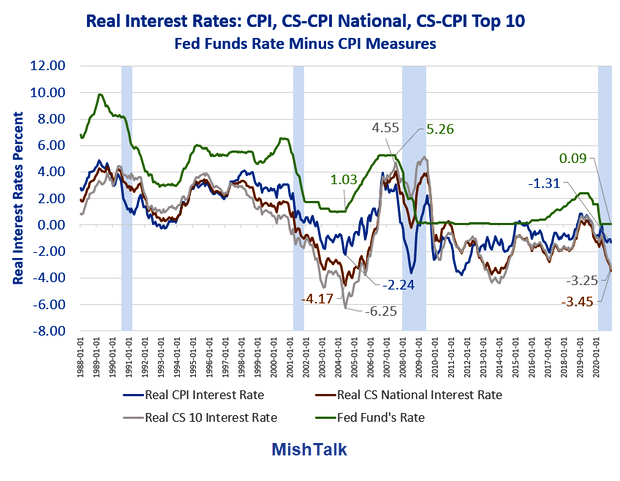 Thanks to the Fed slashing interest rates to near-zero, real interest rates are -3.45% as measured by CS-CPI but “only” -1.31% as measured by the CPI.