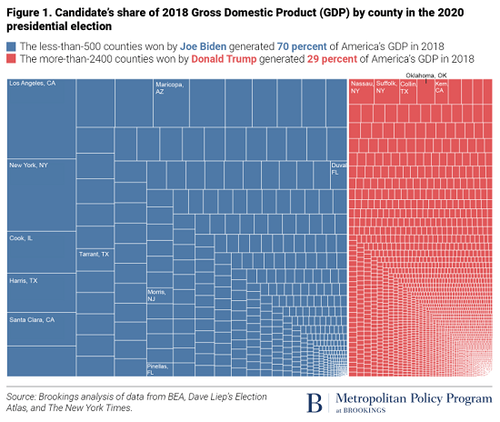 Since the majority of already-super-wealthy and corporate managers reside in coastal metropolitan areas, the tide of new wealth flooding into the hands of the few boosts the economies of these select regions. The Brookings chart below may look like a chart of political polarization, and superficially that’s obvious: the 500 counties Biden won hold 70% of the nation’s GDP while the 2,500 counties Trump won hold 30% of the nation’s GDP.