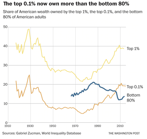 It’s also a fact that the top 10% get virtually all the gains from the nation’s capital, and this wealth is concentrated in the top 0.1%: Monopoly Versus Democracy: How to End a Gilded Age Ten percent of Americans now control 97 percent of all capital income in the country. Nearly half of the new income generated since the global financial crisis of 2008 has gone to the wealthiest one percent of U.S. citizens. The richest three Americans collectively have more wealth than the poorest 160 million Americans.