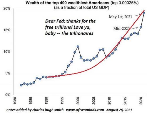 This extreme concentration of wealth and power is not accidental; the government’s policies have generated this concentration of wealth which has hollowed out democracy. The super-wealthy didn’t siphon $50 trillion from those earning their living from labor on their own; government policies aided and abetted this vast transfer of wealth.