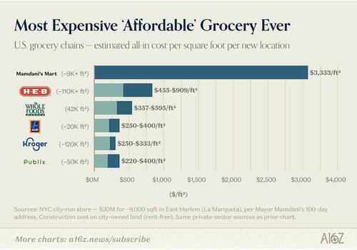 Andreessen Horowitz’s a16z New Media published the most popular charts of the week on financial markets, but the most revealing one came at the end of the note: a comparison suggesting that New York City’s first grocery store, which will soon be run by unhinged socialists, will be structurally less efficient than private-sector supermarkets.