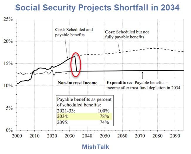 In its 276-page 2021 Annual Report, the Social Security Administrations projects a fiscal cliff starting in 2034.