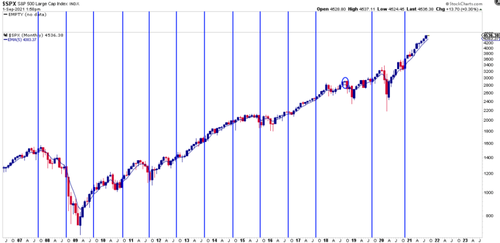 I’ll add one more piece of history for consideration as we are now in September. In the past 15 years $SPX has tagged its monthly 5 EMA in the month of September in every single year but one. That’s a 95% hit rate.