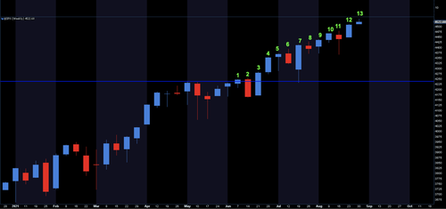 In Failure is not an Option we discussed an unusual program running through markets and the market’s need for constant new highs to prevent a trend break. Since then markets have continued on this required program delivering new highs every week and on many days since then ending August with the most new highs since 1929 and 1987. Quite a feat.