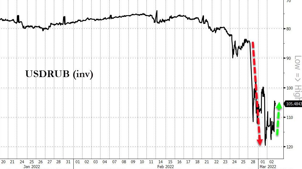 In what one Washington lawyer described to Reuters as the “biggest hammer in the toolshed”, the G7 and European Union governments blocked certain Russian banks’ access to the SWIFT international payment system and also went a step further than many expected by paralyzing about half the Russian central bank’s $630 billion worth of foreign currency and gold reserves. In doing so, the west has undermined Moscow’s ability to defend the ruble – which has lost up to a quarter of its value since Friday alone – and recapitalize sanctioned banks as they face nascent bank runs. In fact, as some admitted, it was the explicit intention of the west to spark bank runs and to crash the Russian financial system from within.