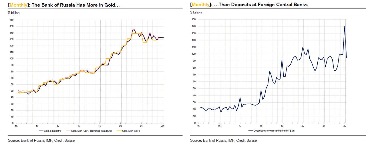 Of course, none of this is a surprise to Russia, which has been feverishly rotating out of its “inside money” dollar reserves, including dumping off all of its U.S. Treasuries in 2018 according to official data, and amassing a record stockpile of gold in the process. In fact, as Pozsar noted over the weekend, “the Bank of Russia now has more gold than deposits at foreign central banks!”