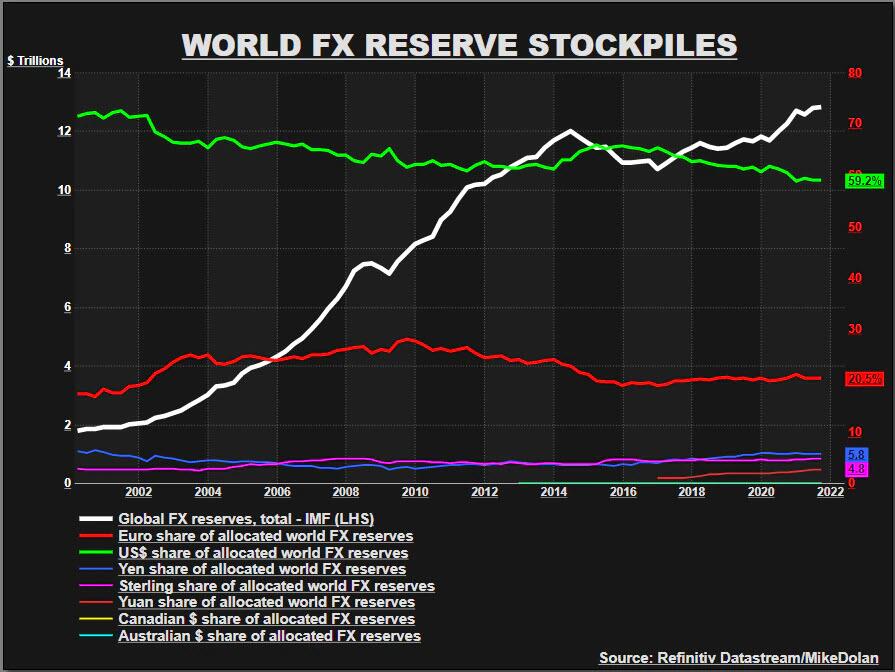 It’s a potentially huge issue for world markets given that central bank foreign currency reserves totaled a record $12.83 trillion late last year – a rise of $11 trillion over the past 20 years. This money is held mostly in U.S. and European government bills and bonds – with the U.S. dollar still accounting for almost 60% of that and the euro about 20%.