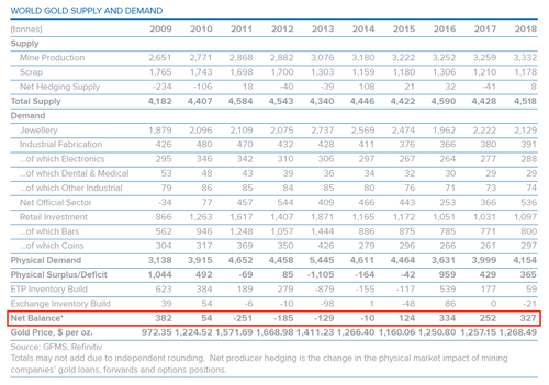 *The fact the net balance is often negatively correlated to the gold price is because GMFS’s largest demand category is jewelry demand. As discussed, jewelry buyers are price sensitive, so when the price goes up jewelry demand goes down, and the net balance flips to a surplus.