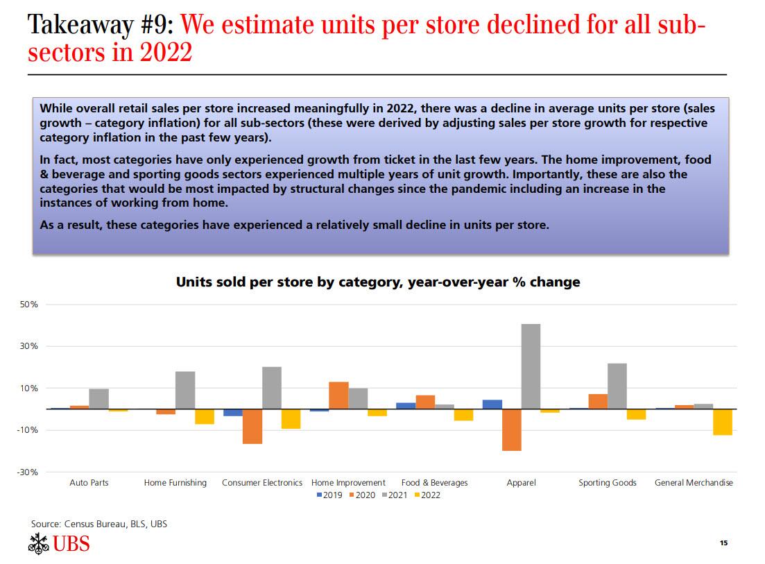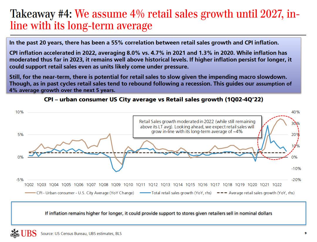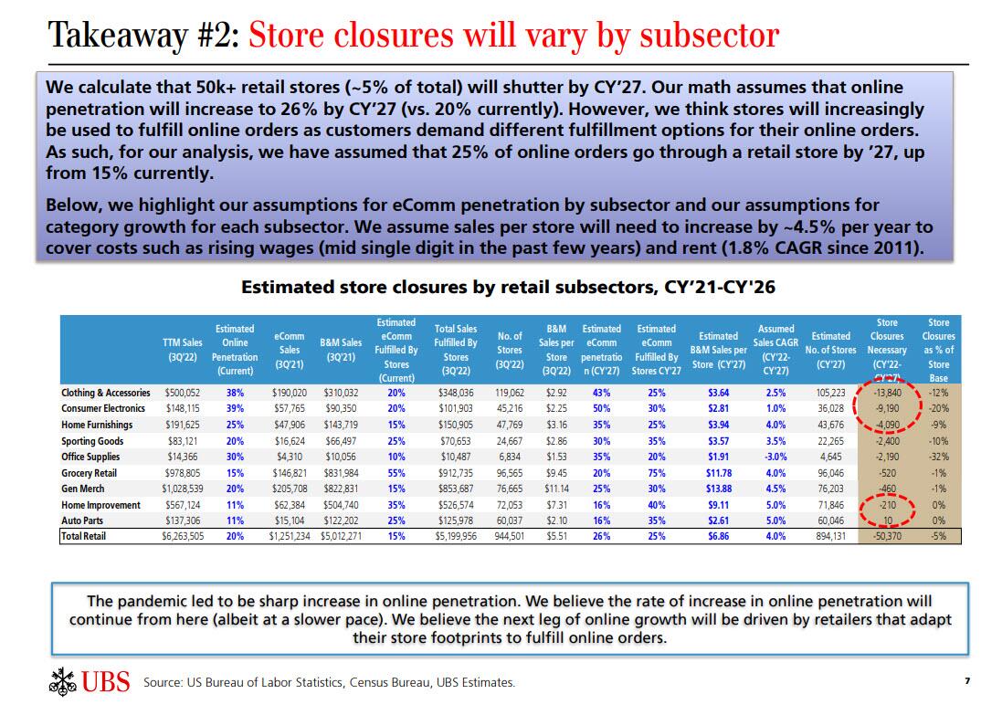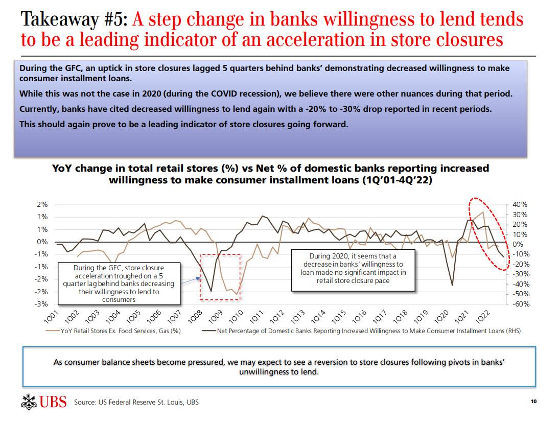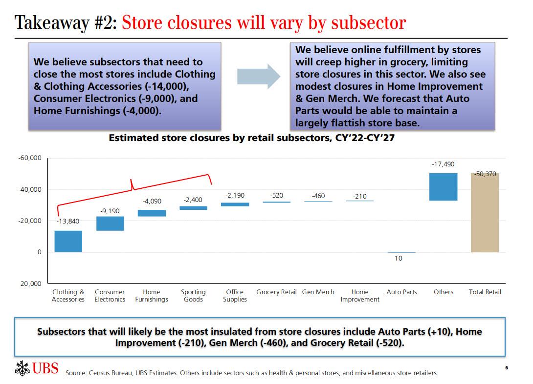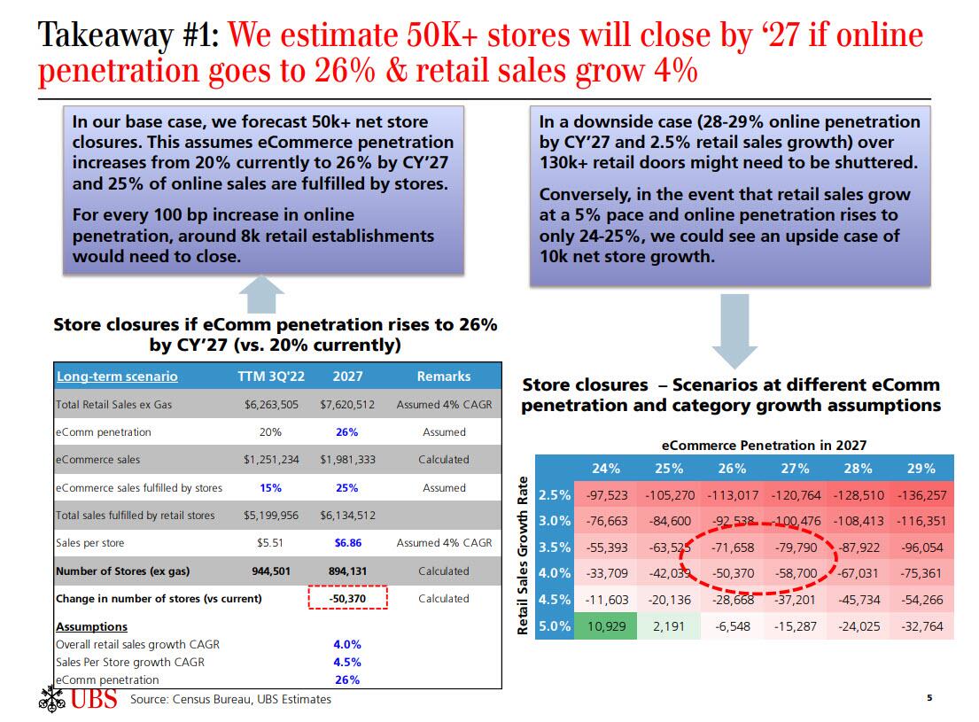 It could get even worse: the base case scenario assumes that retail sales growth continues at 4% annually which is inline with the long-term trend. However, in a downside case, the protracted US recession would put downward pressure on the UBS store closure forecast where if retail sales only grow 3.0-3.5% it would result in 70K-90K closures