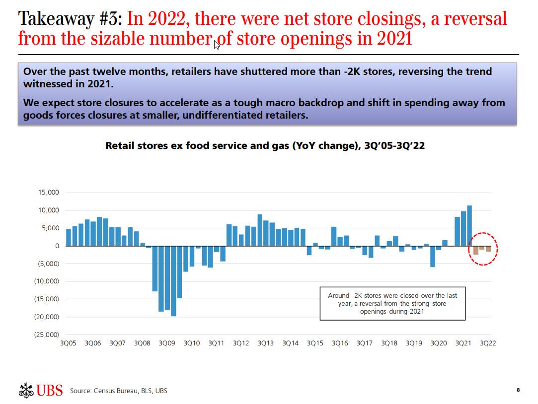 Over 2,000 stores across all retail sectors have closed in the past 12 months according to a recent report from UBS retail analyst Michael Lasser (available to pro subs in the usual place), and that is just the beginning. “As of 3Q’22 (latest available data), retailers shed -1,500 net stores. This number is already up significantly in ‘23 with the likes of Bed Bath & Beyond, Foot Locker, Tuesday Morning and others closing stores recently” the UBS economists wrote.