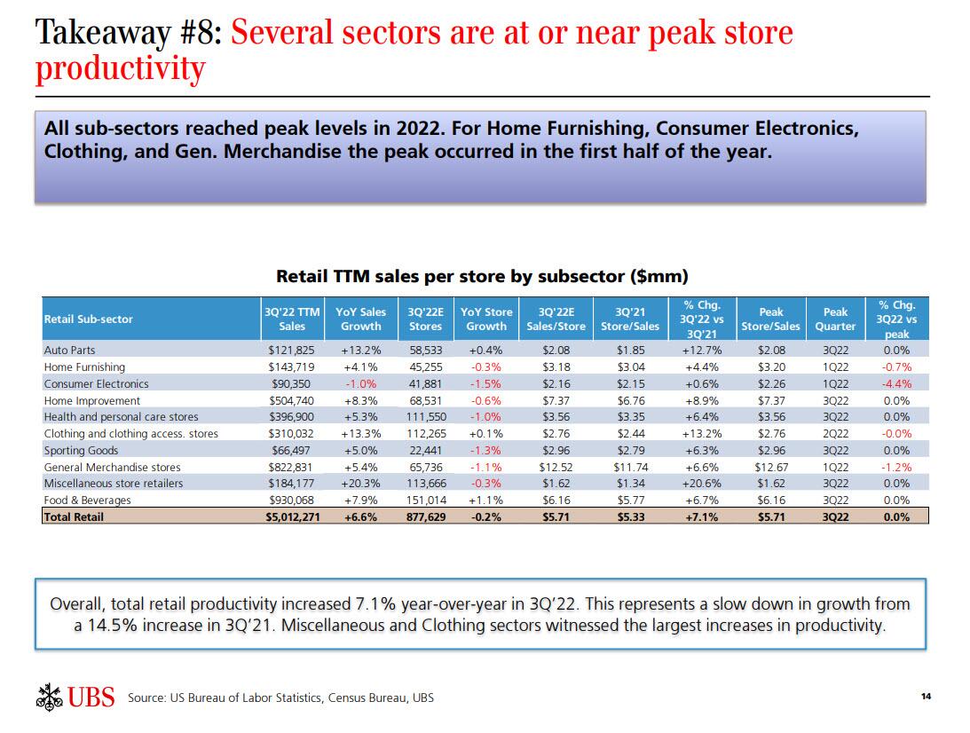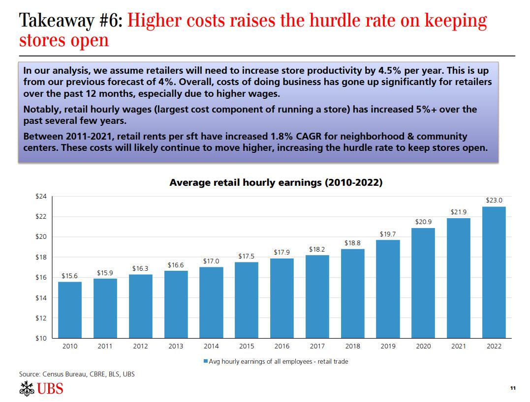 On top of that, retailers will need to increase store productivity by 4.5% annually as retail rents per square foot increase for neighborhood and community centers. “These costs will likely continue to move higher, increasing the hurdle rate to keep stores open,” UBS said.
