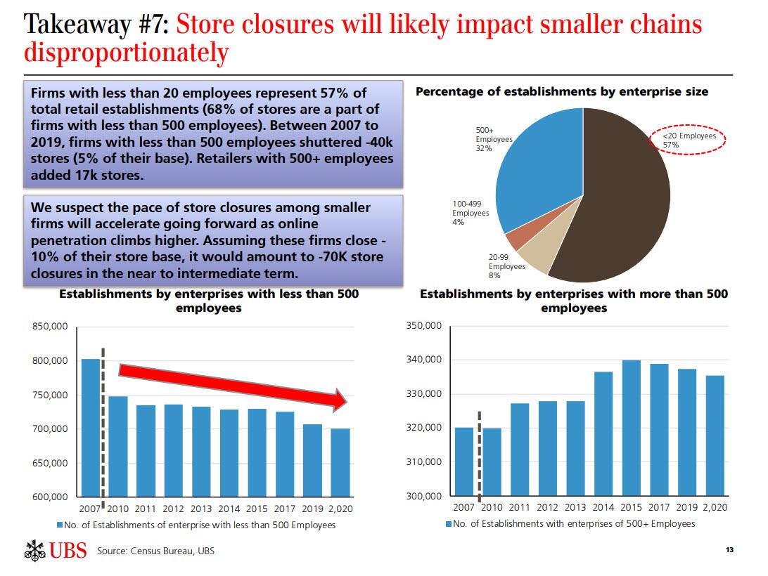 In our view, these smaller chains and mom & pops are most at risk of closures given these firms typically have less access to capital needed to invest in developing a robust omni-channel offering. As of 2020, 57% of retail stores are operated by firms with less than 20 employees and 68% of stores are operated by chains with less than 500 employees. These smaller chains shed -40K stores in the past 10 years while chains with 500+ employees added 17K stores.