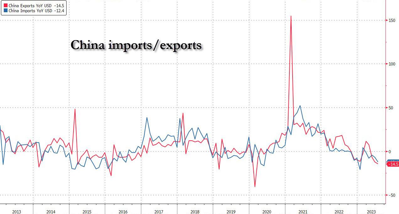 Global stocks slid, US equity futures slumped and bond yields tumbled as a raft of news on collapsing Chinese trade, Italian banks hit with an unexpected windfall tax, and a downgrade of US banks by Moodys (on increasing funding costs/CRE exposure) sparked a fresh round of fears about the financial system and global economy. At 7:45am, S&P futures were down 0.7% trading as low as 4,502 while Nasdaq futures dropped 0.8% amid a broad flight to safety across markets which sent yields on the 10-year Treasury 10 basis points lower and the equivalent rates in Germany fell 15 basis points. The Bloomberg dollar index climbed 0.5% while oil resumed its slide following ugly oil import data by China. Today’s macro data includes Small Biz Optimism, Trade Balance, and Wholesales Sales/Inventories … nothing market-moving as we await Thursday’s CPI print.