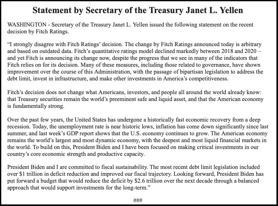 Treasury Secretary Janet Yellen said that the downgrade was “arbitrary and based on outdated data,” adding “Today, the unemployment rate is near historic lows, inflation has come down significantly since last summer, and last week’s GDP report shows that the U.S. economy continues to grow.”