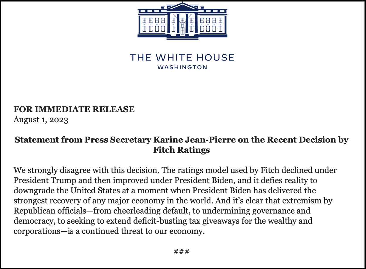 The new regime talking points are out – namely that Fitch downgraded the US credit rating from AAA to AA+ on Tuesday because of MAGA Republicans and all things Trump.