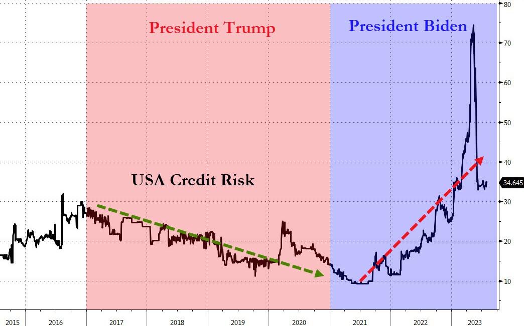 Bernstein reflected on the “cognitive dissonance” he felt at the downgrade amid the success of ‘Bidenomics’ commenting that “creditworthiness deteriorated significantly under President Trump for good reasons… and under President Biden, it started to track back up…”