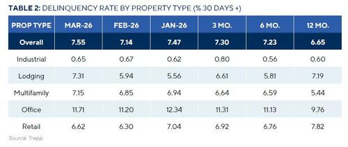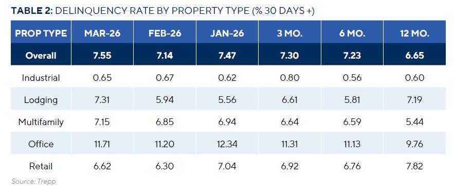 At the property-type level, four of the five major property type rates increased while one edged down slightly. Lodging posted the largest increase, jumping 137 basis points to 7.31%, the first time it has been above 7% since its recent April 2025 peak of 7.85%. Office rose 51 basis points to 11.71%, maintaining the elevated range established over the past year, but remaining below January 2026’s recent high of 12.34%. Retail increased 32 basis points to 6.62%, rising from February’s recent low of 6.30% but remaining below the higher readings observed in 2024 and early 2025, when that rate averaged 6.71%. Multifamily was also especially week, as the delinquency rate rose 30 basis points to 7.15%, pushing slightly above its prior high-water mark of 7.12% in October 2025, and well past its marks from one year ago of 5.44% and 1.84% two years ago. Industrial – a stable category which includes warehouse and data center REITs – dipped slightly to 0.65% from 0.67%, continuing to sit near the bottom of the major property-type delinquency spectrum.